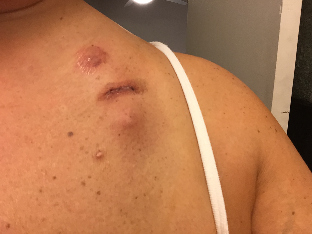 The port, while a little bigger than a quarter in diameter, sticks up from my chest a lot more than I would have thought.  Right now it hurts, and itches like the devil.  Tylenol is my friend.  I’m hoping the pain will go away as my body adjusts to it; experience tells me it will.